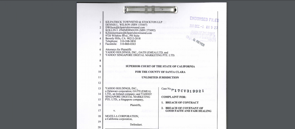 Mozilla在11月中宣布Firefox预设搜寻引擎将从Yahoo改为Google搜寻,因搜寻引擎合约尚未到期即琵琶别抱,12月1日Yahoo控股与Oath在圣塔克拉拉法院控告Mozilla不当单方面终止合约,Mozilla也不甘示弱在12月5日提出反诉,藉此伸张权益以保与Yahoo的合约确实被履行。为此Mozilla将上传相关法院文件至维基页面,接受公评。